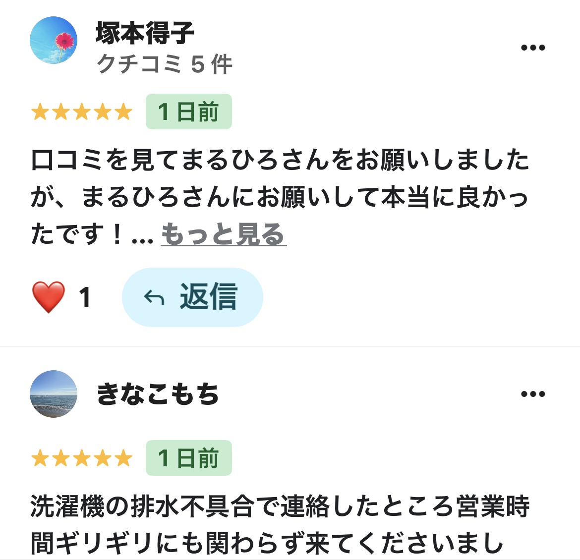 ★★★★★5 2026/04/22 きなこもちさま 洗濯機の排水不具合で連絡したところ営業時間ギリギリにも関わらず来てくださいました。清掃も頼みたいところでした…