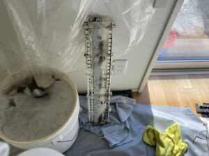 それでもダメだと、メーカーに依頼して点検してもらいますが、メーカー修理スタッフに「これはエアコンの汚れが原因です」と言われてしまいます、、、この流れのクリーニングのご依頼も多いです。