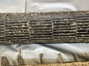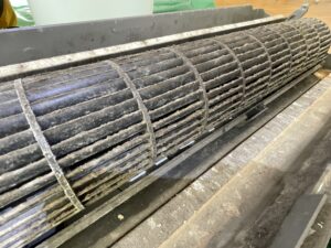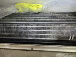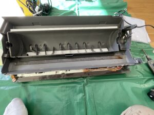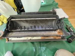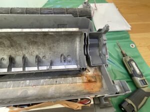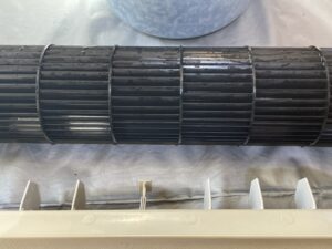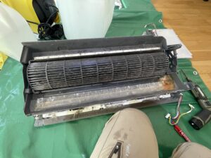 • 送風ファンの抜き出し:風を送り出す回転羽を外すことで、その奥にある熱交換器の裏側まで高圧洗浄が可能になります。