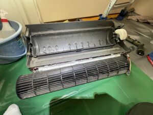 作業を見せていただきましたが、外した部品の裏側やドレンパンに黒カビがびっしり生えていてゾッとしました…。専用の機械で大量の水を使って洗い流していただき、見違えるようにピカピカになりました!