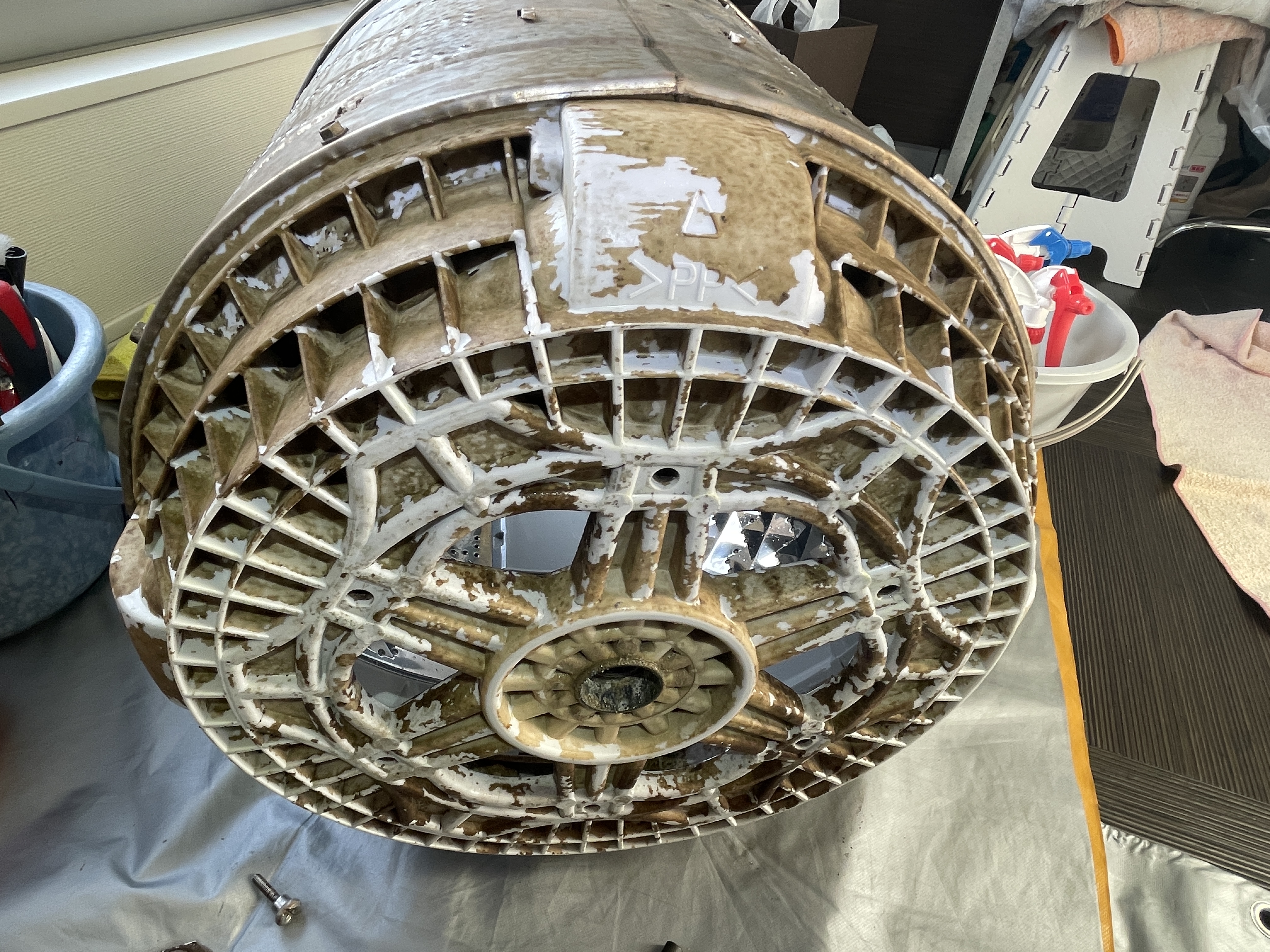 カバー類、各パーツの取外し後、アルカリ・塩素系洗剤を使用し、高圧洗浄機で部品