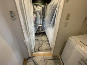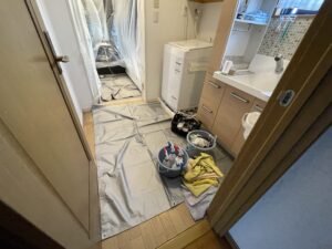浴室・洗面室(洗濯機場)の周囲へのキズや汚れ防止のための養生をしっかりと行い、