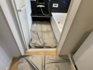 浴室・洗面室(洗濯機場)の周囲へのキズや汚れ防止のための養生をしっかりと行い、
