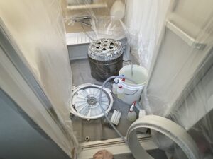 浴室・洗面室(洗濯機場)の周囲へのキズや汚れ防止のための養生をしっかりと行い、