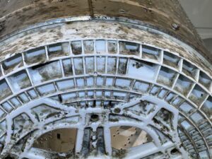 カバー類、各パーツの取外し後、アルカリ・塩素系洗剤を使用し、高圧洗浄機で部品