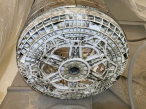 カバー類、各パーツの取外し後、アルカリ・塩素系洗剤を使用し、高圧洗浄機で部品