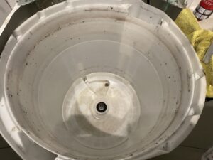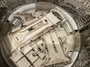 洗濯槽の底部も入り組んだ構造の為、汚れが深くまで入っています、黒カビ雑菌汚れです。