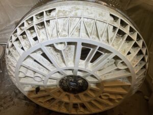 カバー類、各パーツの取外し後、アルカリ・塩素系洗剤を使用し、高圧洗浄機で部品