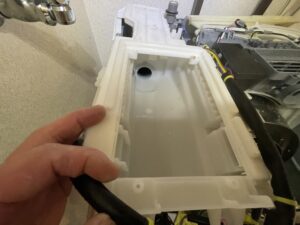 洗濯槽内に水溜まりあり、試運転できず・・・