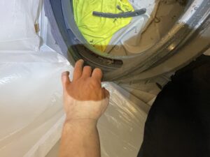 浴室・洗面室(洗濯機場)の周囲へのキズや汚れ防止のための養生をしっかりと行い、