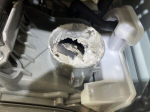 異物が洗濯機内部で動くことで、プラスチック部品を突き破ったり、他の重要な部品を傷つけたりする可能性があります。 -