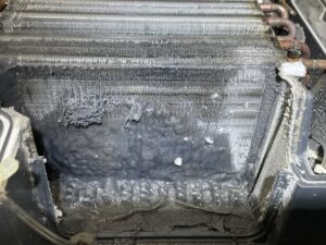ヒートポンプユニット、熱交換器の入口部の 繊維くず・ホコリ 汚れがヘドロ状に汚れていますね!